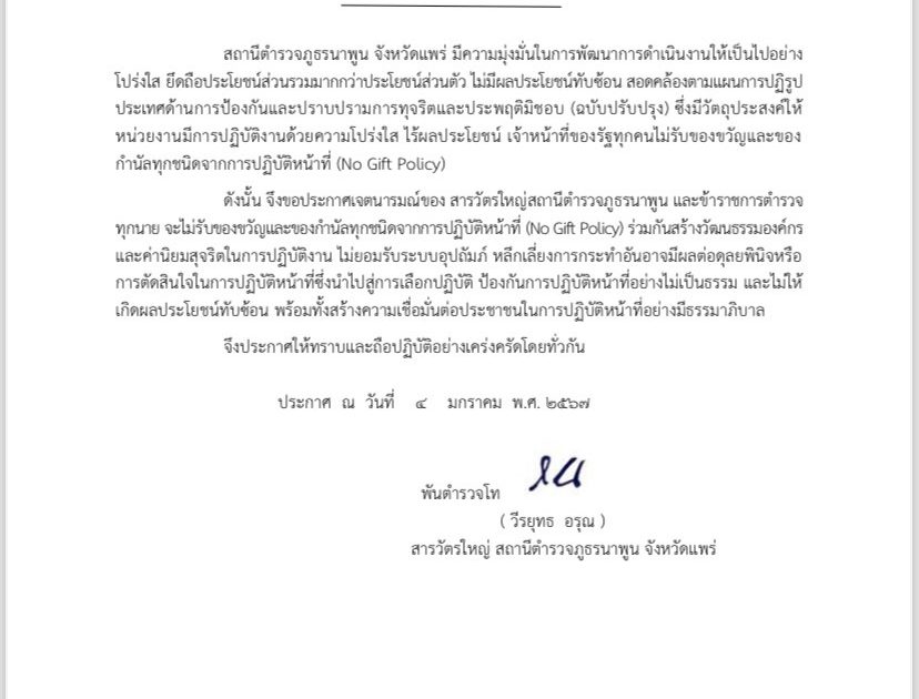สถานีตำรวจภูธรนาพูน ประกาศนโยบายต่อต้านการรับสินบน(Anti-Bribery Policy) และนโยบายไม่รับของขวัญและของกำนัลทุกชนิด(No Gift Policy) จากการปฏิบัติหน้า 4 เมษายน 2024 โดย admin / ข่าวประชาสัมพันธ์,ข่าวประชาสัมพันธ์,ข่าวฝากประชาสัมพันธ์